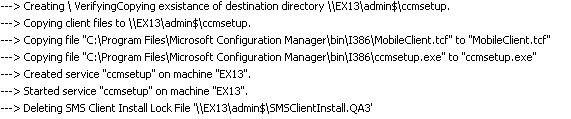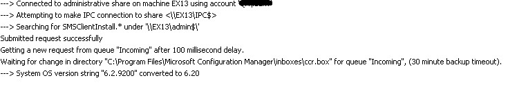 - When client push installation request start, the request can be view in CCM.log on the SCCM server (locate under %programfiles%Microsoft Configuration ManagerLogs). This is the place to look for errors if there is any communication issue between the SCCM server and the target workstation: